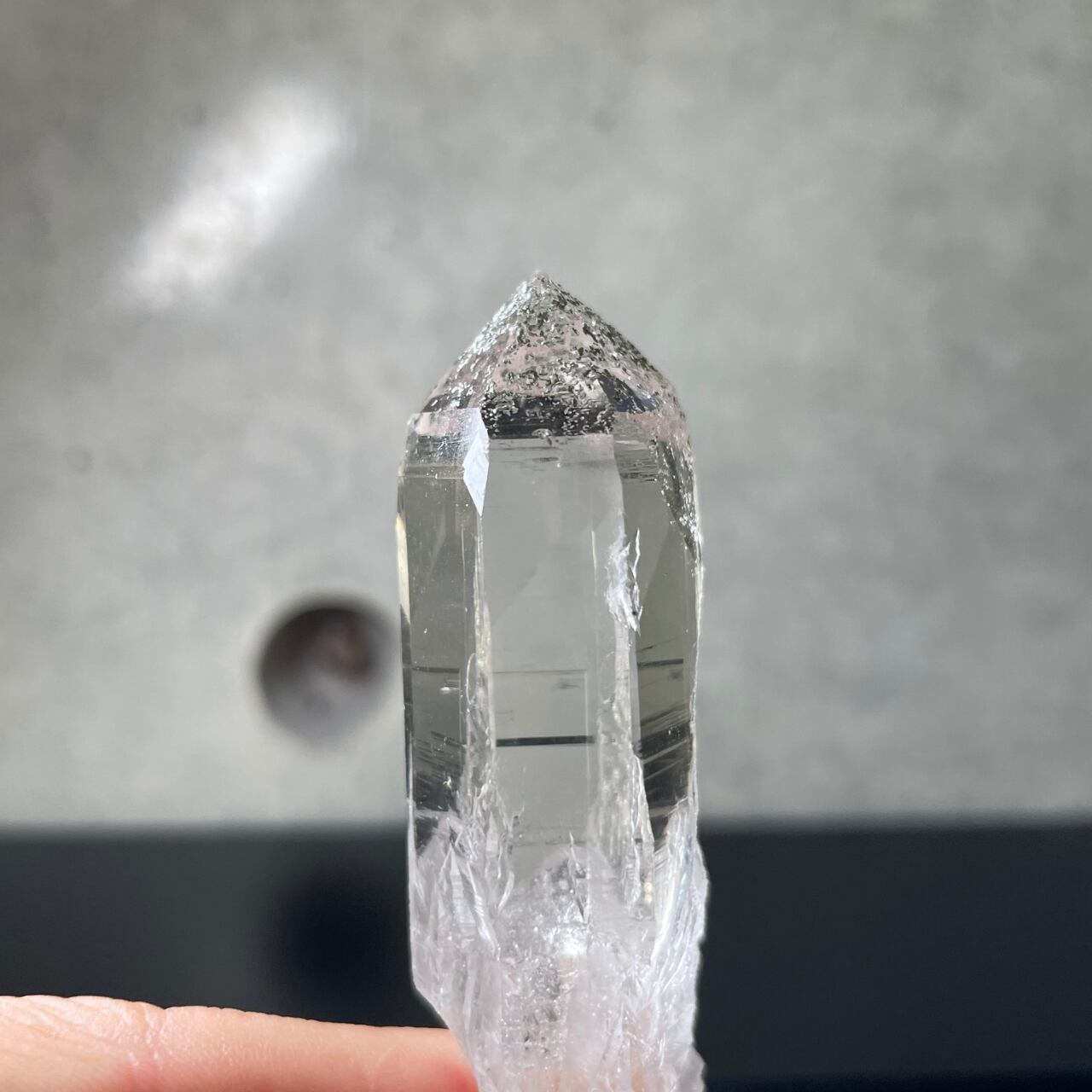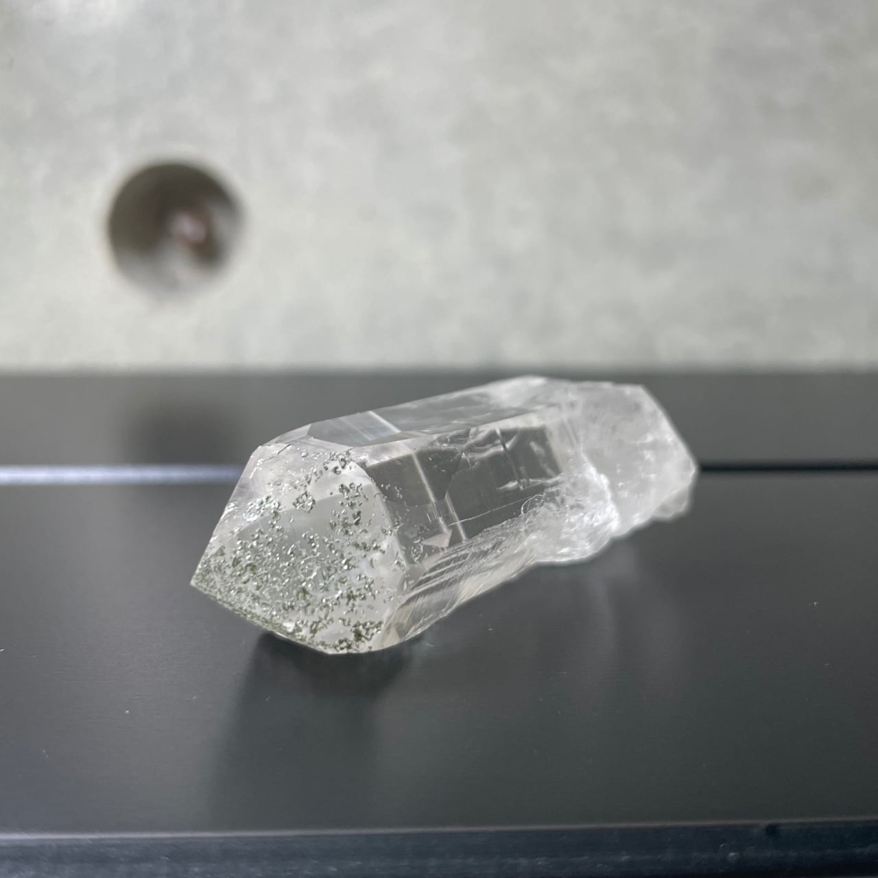 その特徴は、何といってもこの驚くほどの透明度と先端にバランスよく配置された美しいクローライト。理想的な形状を持ち、インテリアだけでなく、持ち運べるお守りとしてもペンデュラムとしてもご利用いただける万能な一品です。