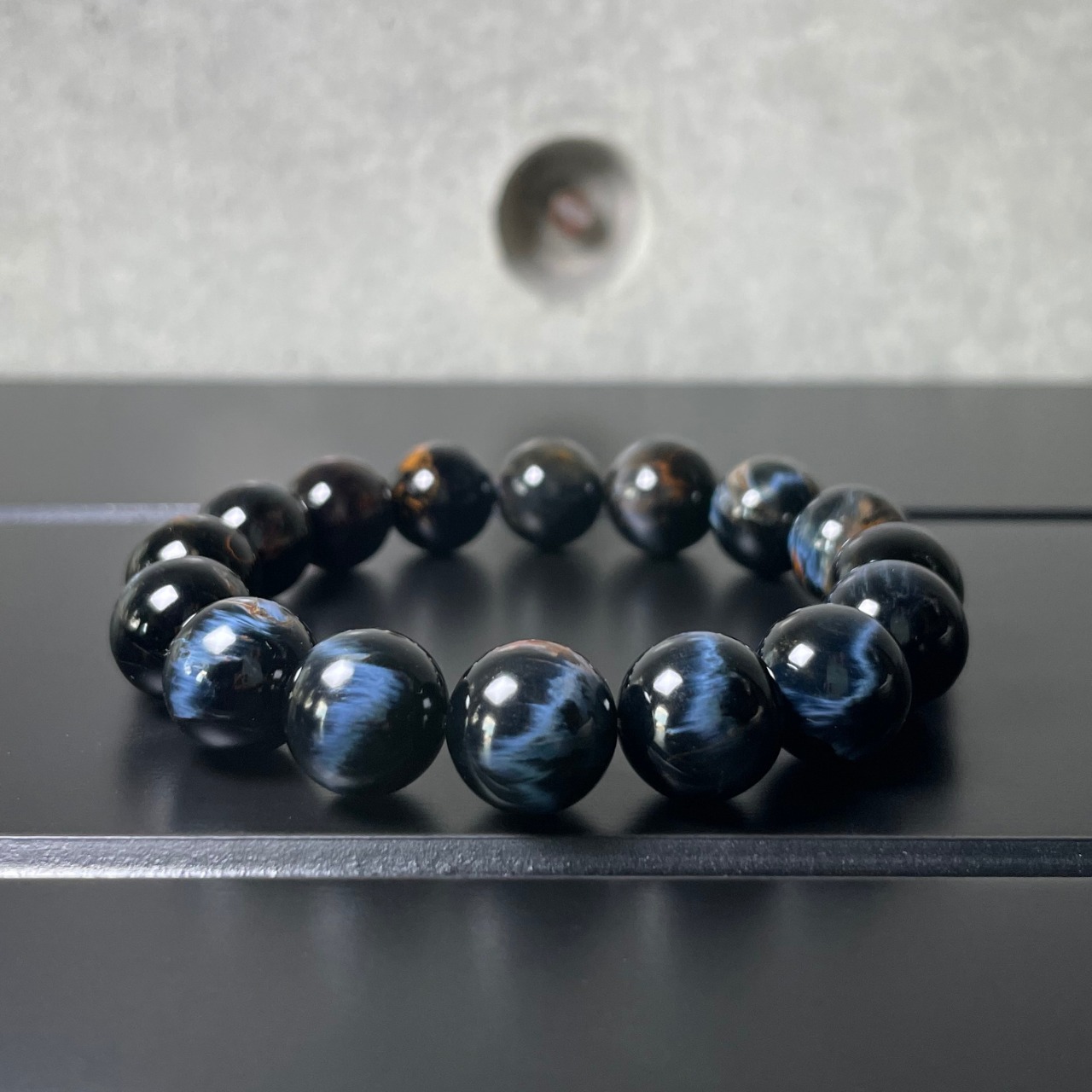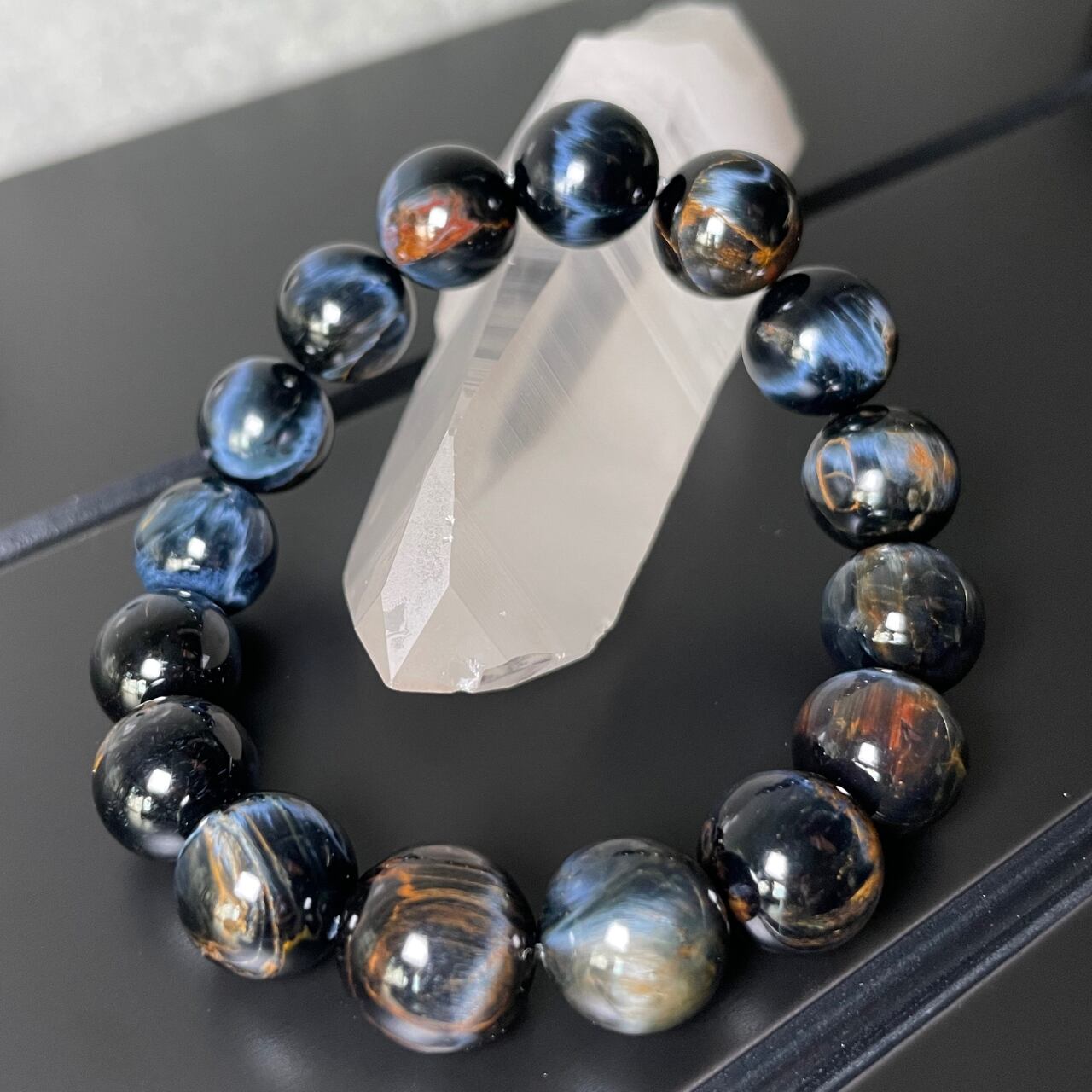 特にこのホークスアイを彷彿とさせるような青目が綺麗に入ったピーターサイトの珠のみで組み上げられたブレスレットは、変わり種でもあり、かなり希少で貴重な極上の逸品です。