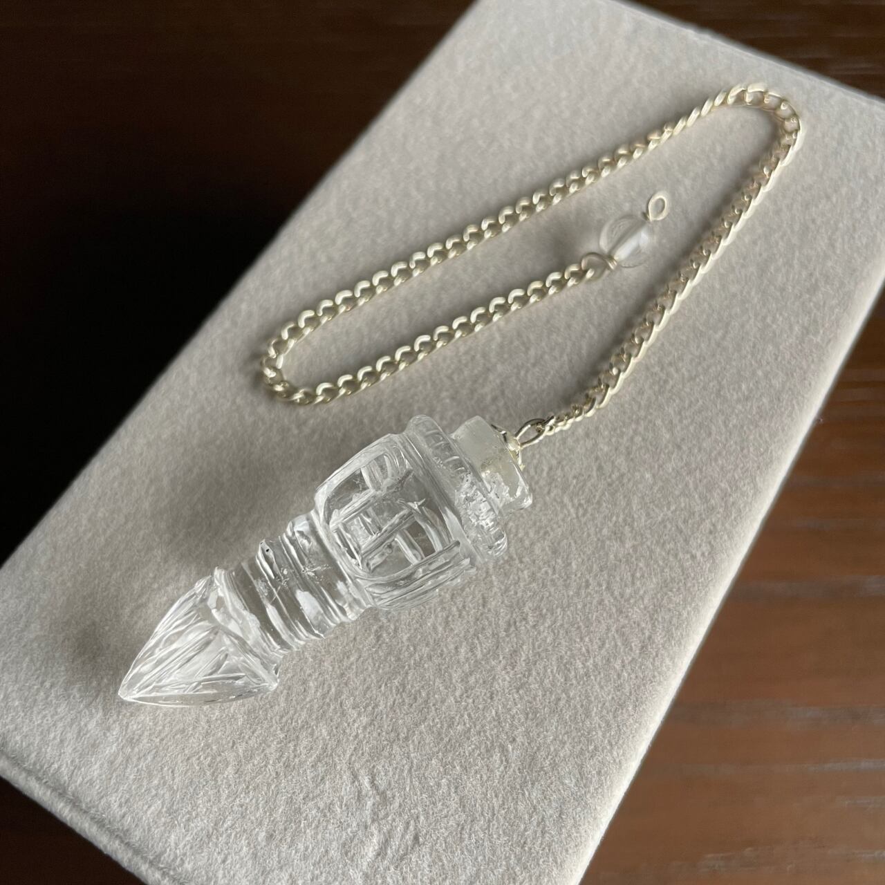 強力な守護と覚醒の象徴である「バジュラ(金剛杵)」の形に仕上げた特別なペンデュラムです。